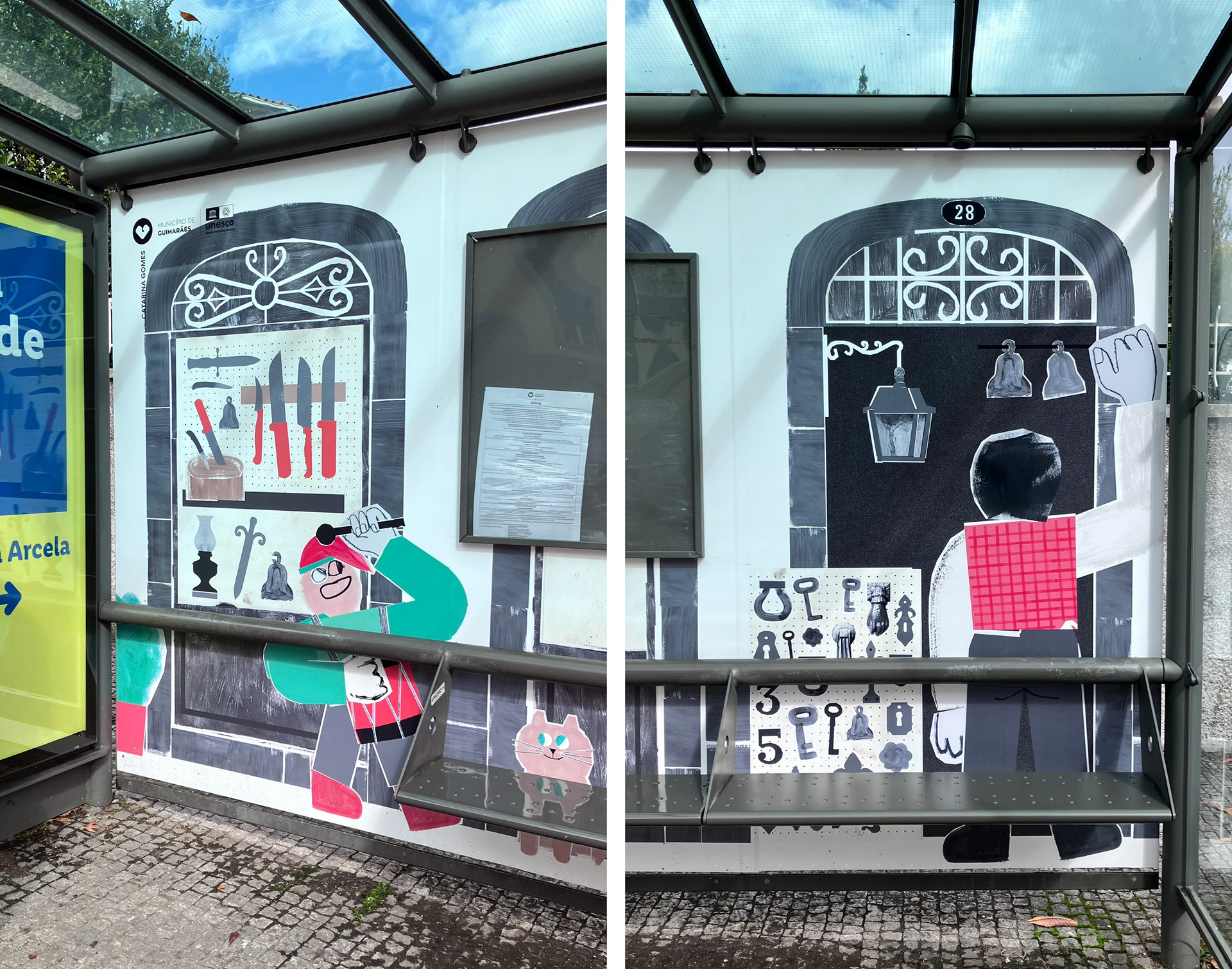 Urban intervention in the bus stop shelters. 2024 theme: Commemorations of Zona de Couros (Guimarães) to UNESCO World Heritage Site Art direction - Silvadesigners