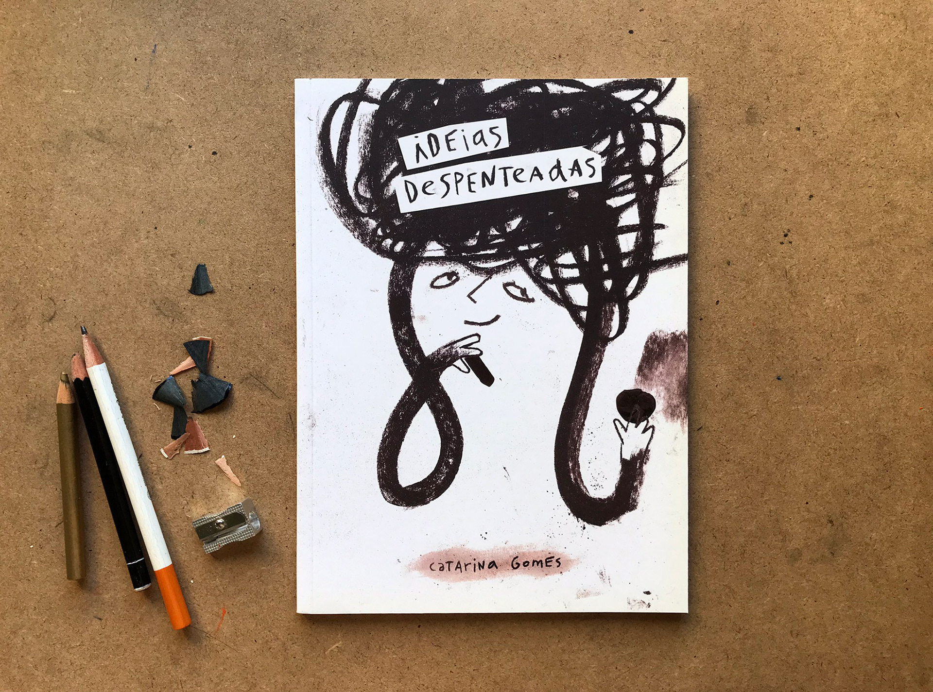 Ideias despenteadas - an activity book that invites the reader to draw using a technique or a material inspired by the illustration that precedes it. Drawing with the comb, rubber, or newspaper cutouts are some of the suggested ideas. 16 × 22 cm, 48 pages